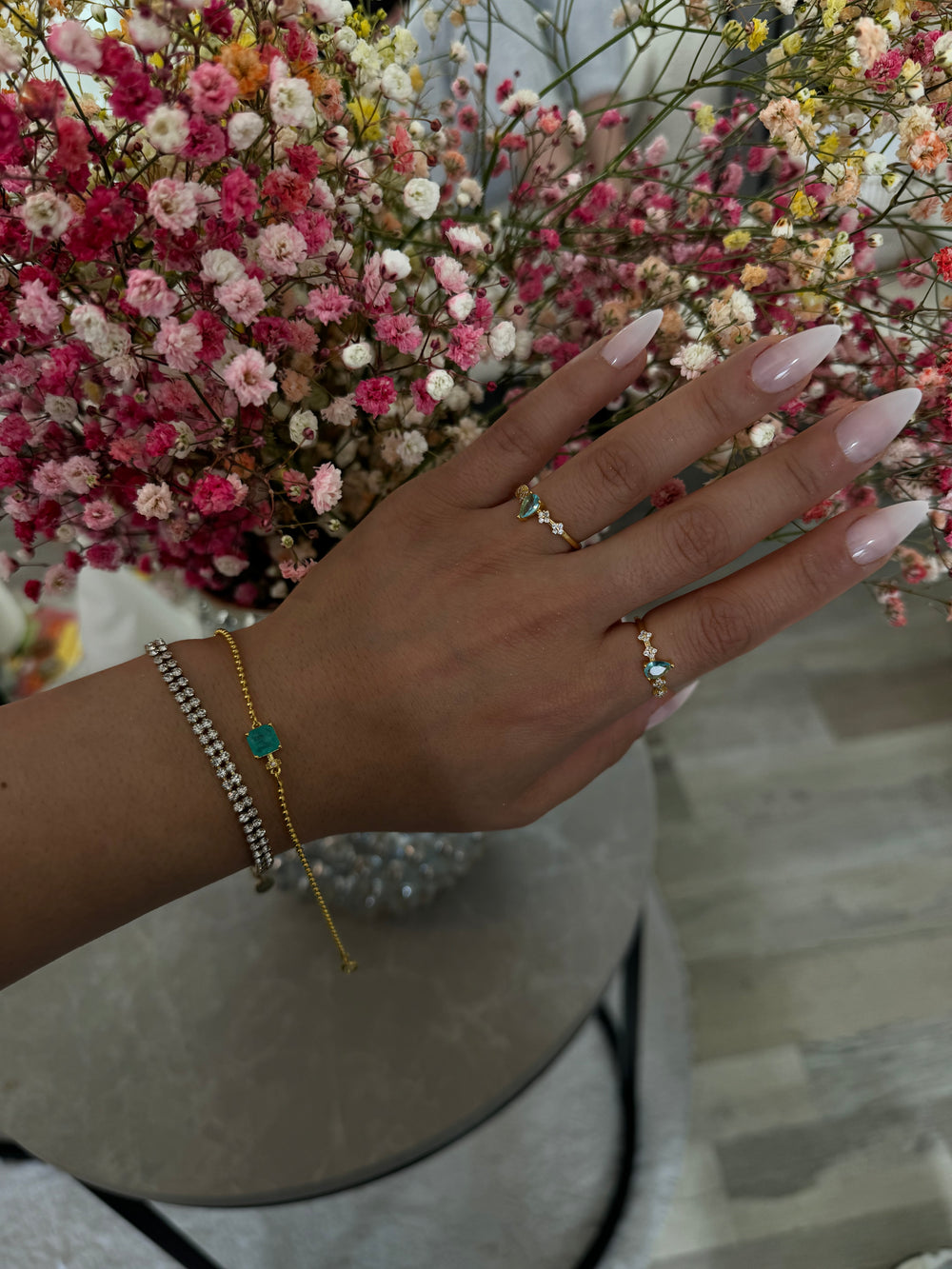 Gorgeous golden bracelet with a light blue square diamond stone. This bracelet is made of high quality 925 sterling silver layered with multipule layers of 18k gold plating.