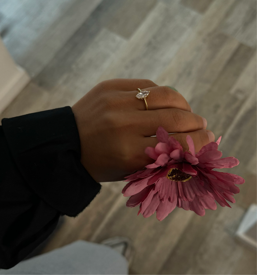 Gorgeous Asena ring with a big oval zirconia stone. Made of high quality 925 sterling silver and layered with 18k gold plating. Its even more beautiful to match this ring with the Elmas necklace.