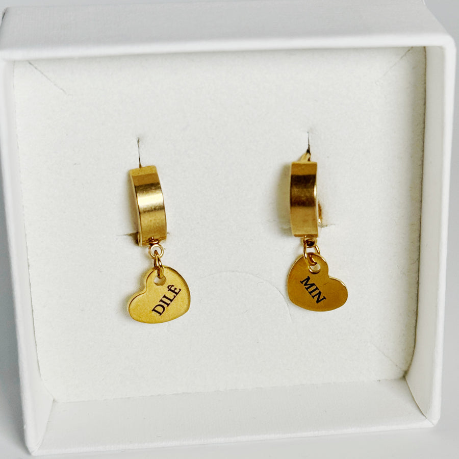 Pretty earrings with the text “Dilê Min” engraved. It means My heart in Kurdish. This text is usually used in a romantic way. You can either gift this to your loved ones or spoil yourself.
