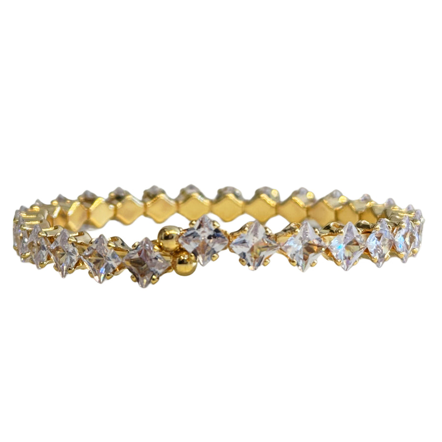 Add a luxurious shimmer to your wrist with this elegant flexible bangle, featuring a continuous line of diagonally set square-shaped stones. Crafted from gold-tone brass, this bracelet bends gently for a comfortable fit and a sleek, sophisticated look.